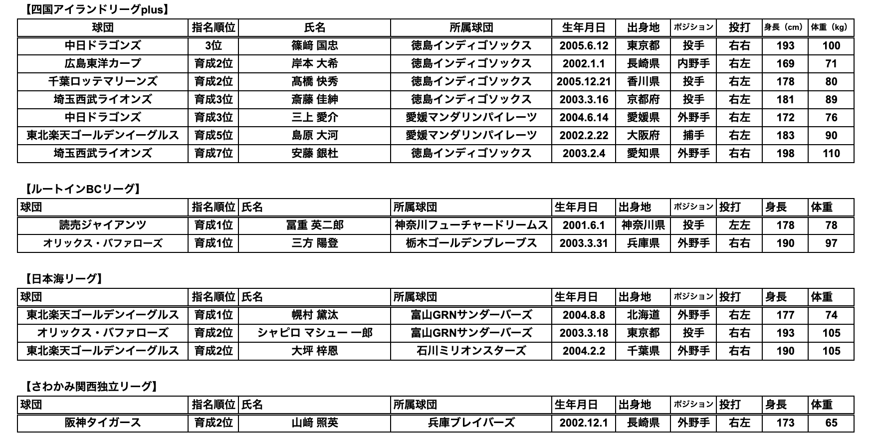 当機構及び6リーグでは、今後とも日本野球界の底辺拡大及び発展の為に尽力していきたいと思います。なお、今年の指名選手は以下のとおりです。選手個々の詳しいプロフィールや情報は、それぞれの所属球団またはリーグにお問い合わせ下さい。